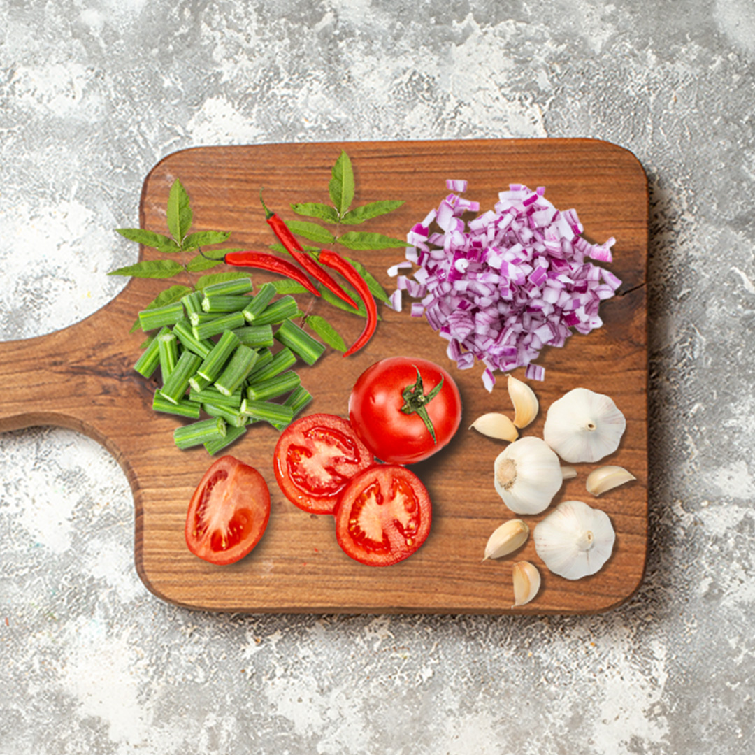 Sambhar mix ( Drumstick + tomato + onion + curry leaves + chilli + garlic )